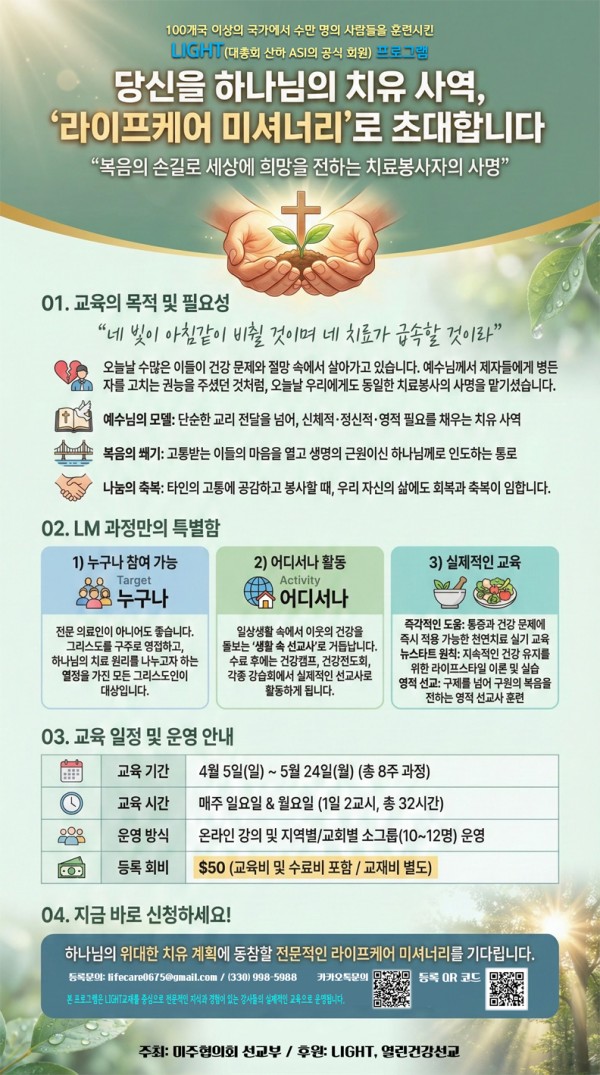 1) 누구나 참여 가능 * 전문 의료인이 아니어도 충분합니다. 그리스도를 구주로 영접하고, 하나님의 치료 원리를 나누고자 하는 열정을 가진 모든 그리스도인이 대상입니다.