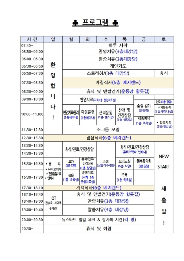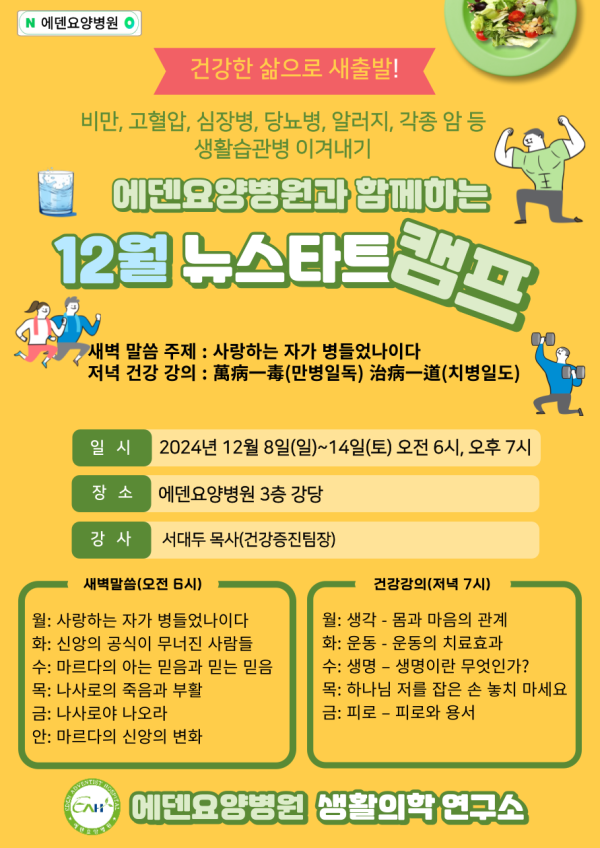 에덴요양병원 생활의학연구소에서 주관하는 12월 뉴스타트 캠프가 12월8일(일)부터 14일(토)까지 진행됩니다!